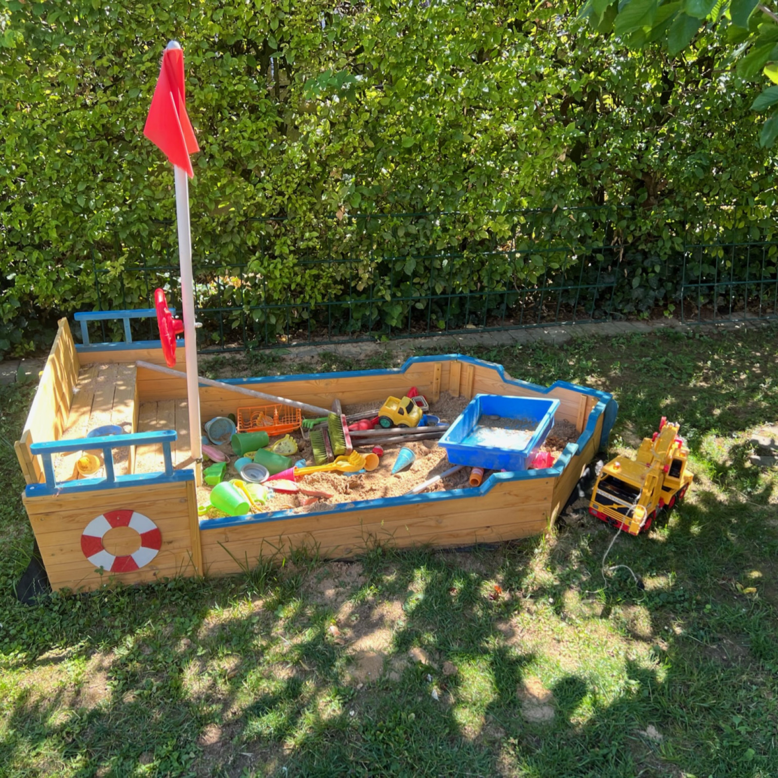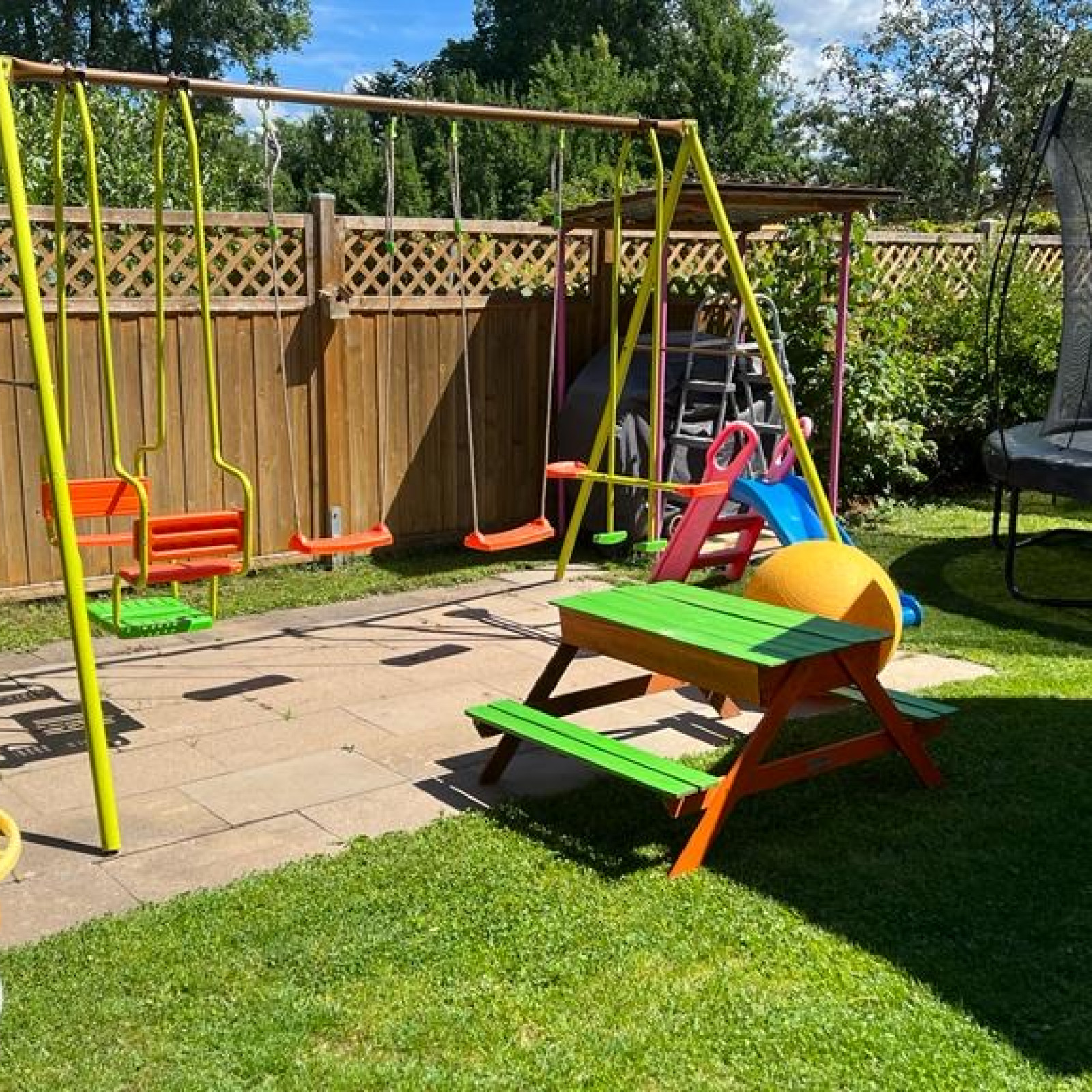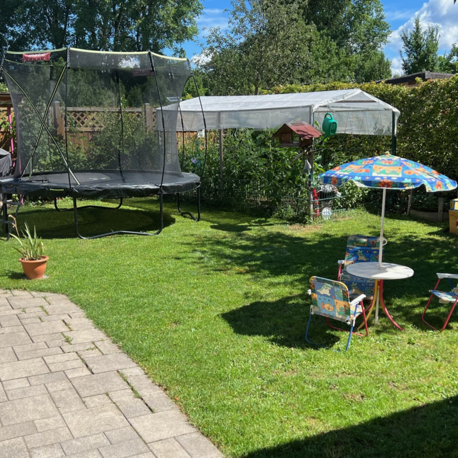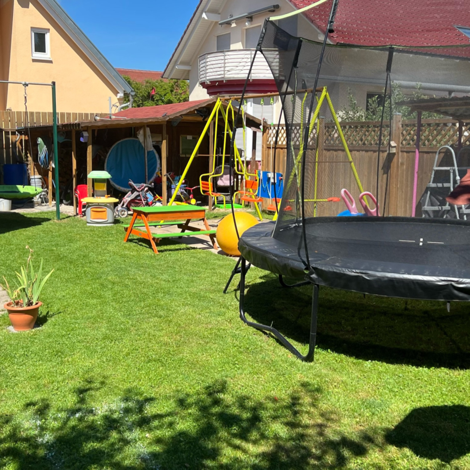 Auf der Grünfläche sind eine Schaukel und ein Trampolin aufgestellt und bieten Spaß und körperliche Aktivität. Ein Sandkasten, eine Rutsche und Bobby-Cars erweitert das Angebot für die Kinder.